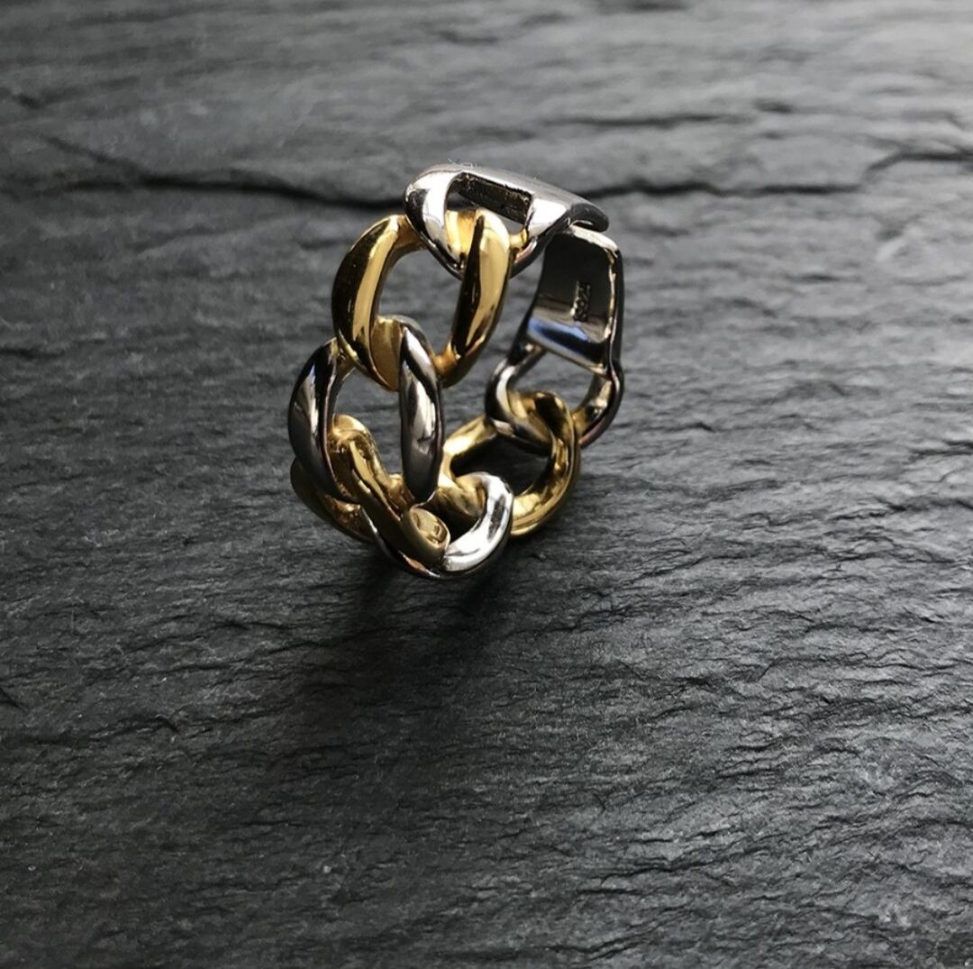 手元にしっかりと存在感を放つ、シルバーとゴールドのミックスリング。